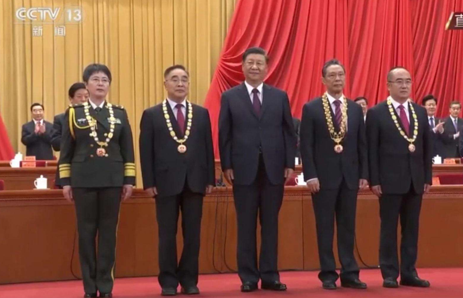 在全場熱烈的掌聲中,在人們崇敬的目光注視下,4位國家勛章和國家榮譽稱號獲得者受邀到主席臺就座。